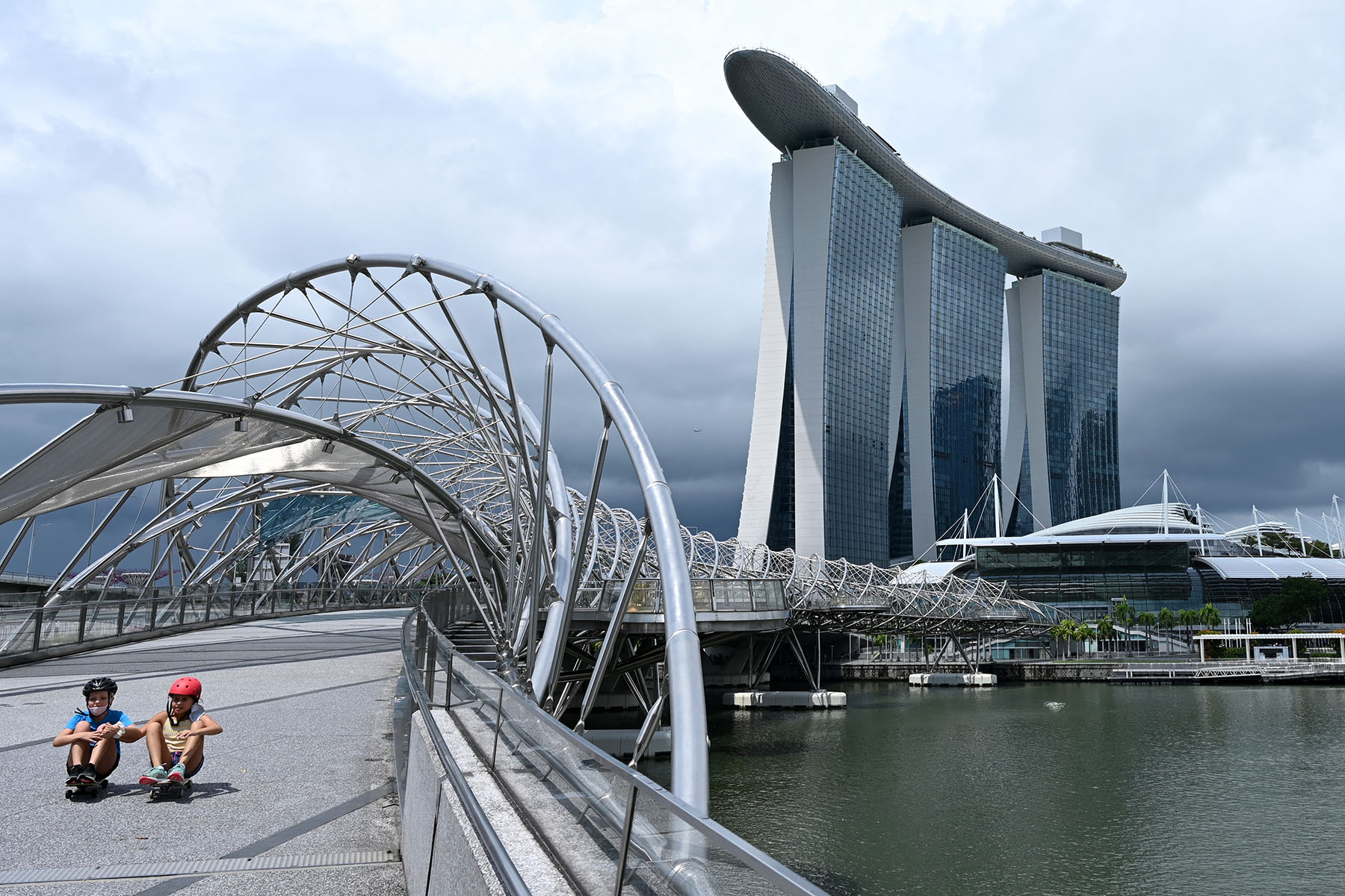 Children ride on skateboards along the Helix bridge at Marina Bay in Singapore on July 5, 2021. (PHOTO / AFP)